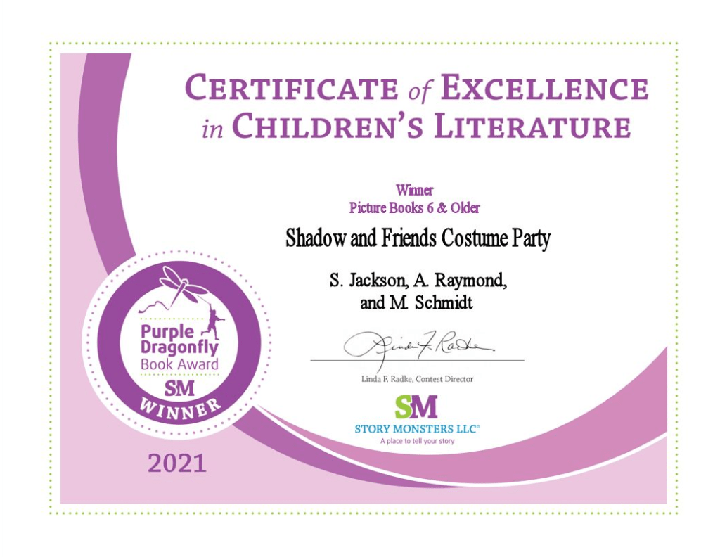 Shadow and Friends Costume Party was a Winner in the Purple Dragonfly Book Awards, Category: Picture Books 6 & Older